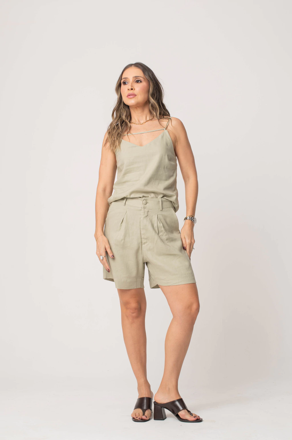 A Bermuda Thanandra é a peça ideal para quem busca unir estilo clássico e conforto em um só look. Confeccionada em tecido de linho com viscose, ela oferece leveza e frescor, perfeita para os dias quentes com um toque de sofisticação.