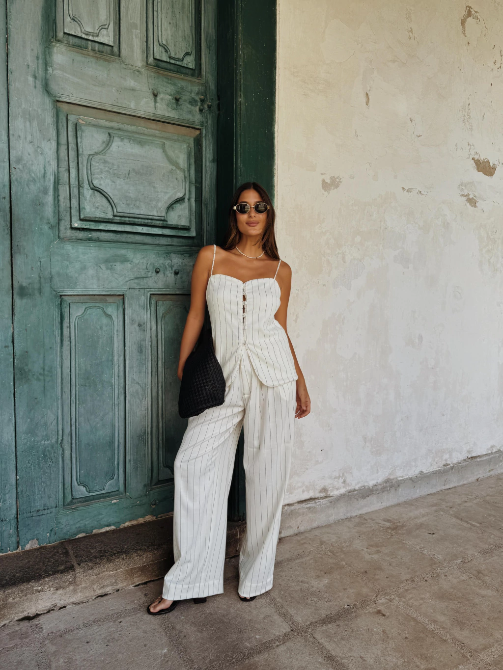 Blusa em tecido leve, com estampa listrada vertical que alonga a silhueta. Possui alças finas, abotoamento frontal com botões forrados e barra em corte arredondado, trazendo sofisticação e modernidade.