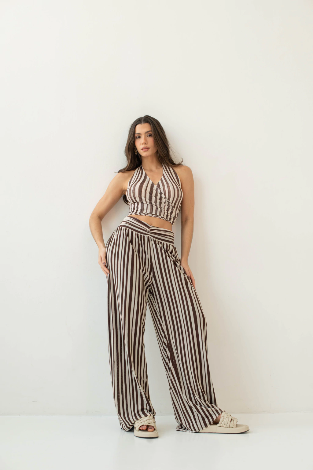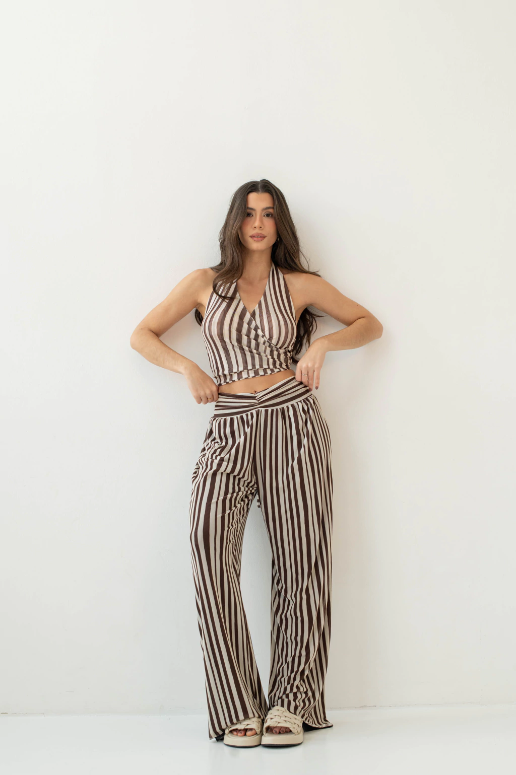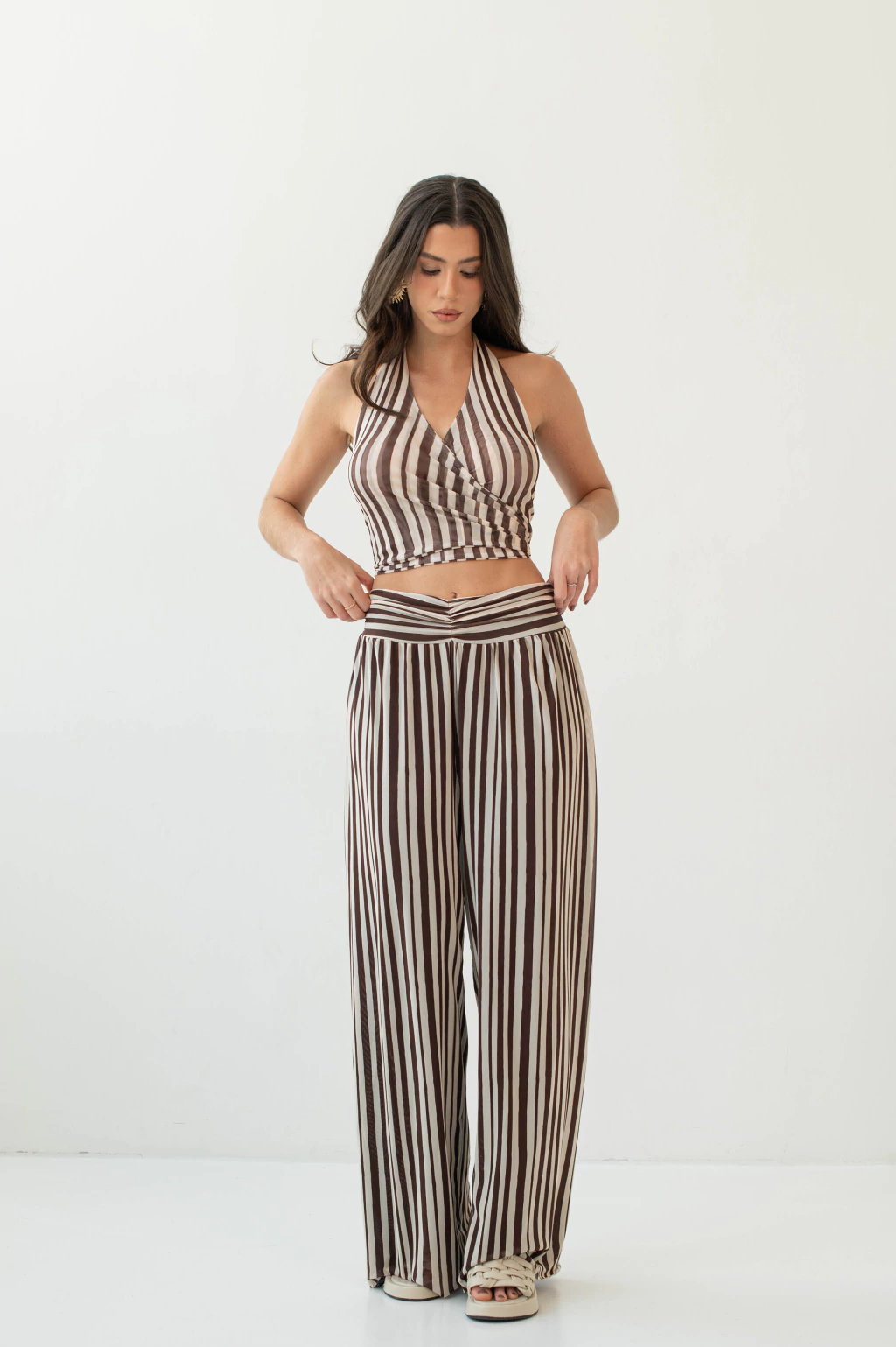 Cropped com decote frontal cruzado, que valoriza o colo e cria um visual moderno e feminino.