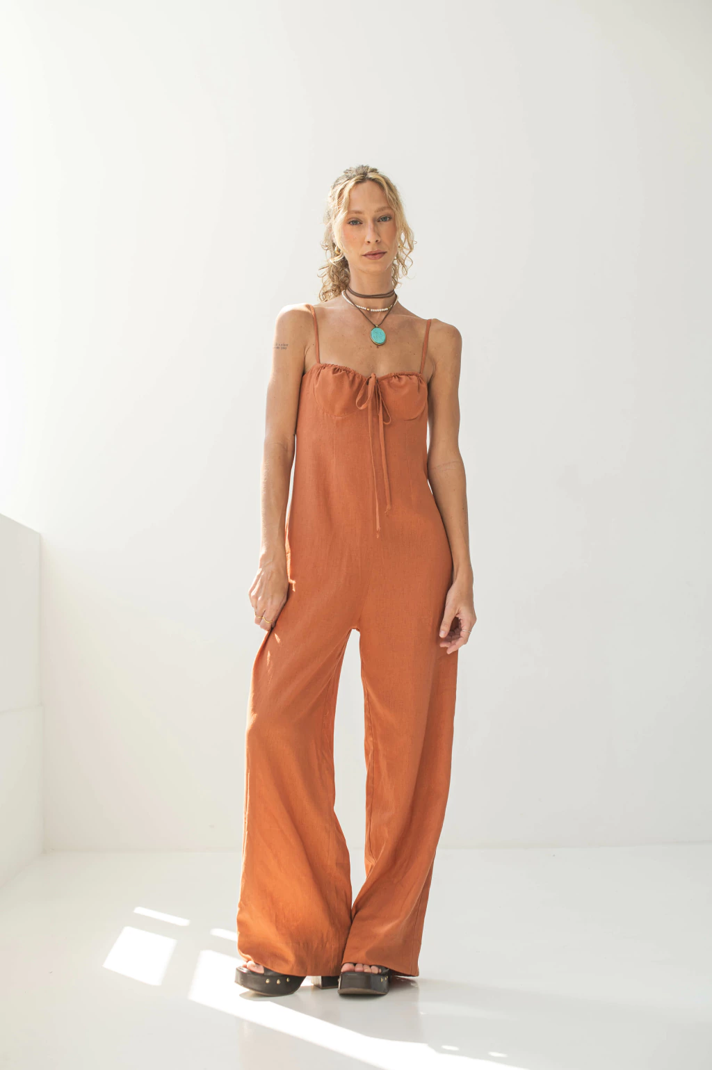 Este macacão apresenta alças finas que conferem delicadeza, junto ao decote reto com franzido que realça o colo com feminilidade. A amarração frontal é um detalhe especial que adiciona um toque de charme e modernidade à peça.