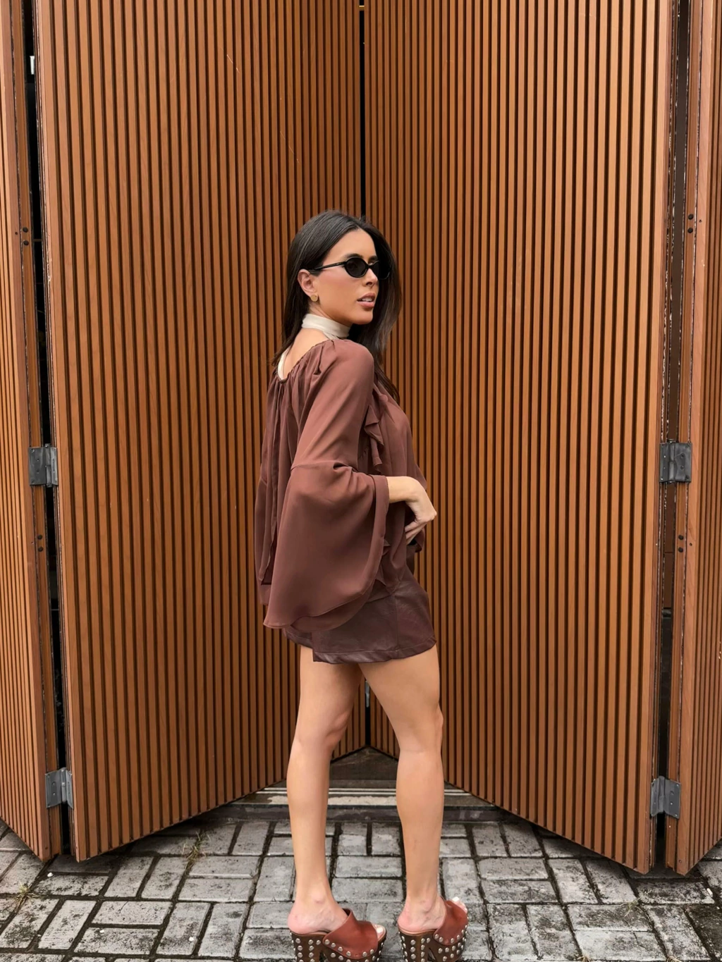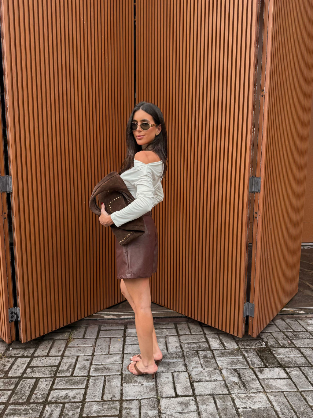 O short de courino É feito de material sintético com acabamento que imita couro. A peça possui cintura alta e modelagem ajustada ao corpo, valorizando a silhueta. O destaque fica por conta do detalhe frontal com amarração em ilhós metálicos, que confere um toque fashion e levemente rocker. Ele também conta com bolsos frontais e barra reta. Uma peça versátil, perfeita para composições estilosas com t-shirts, camisas ou jaquetas jeans, como na imagem.